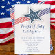 Etoile moderne quatrième juillet de l'invitation avec une étoile bleue avec rayures rouges et bleues sur un arrière - plan blanc. Retournez le dos de notre invitation de vacances patriotique d'été pour voir une bande de retour correspondante. Invitation élégante pour un barbecue commémoratif, 4 juillet cuisine, fête du Travail ou toute fête à thème patriote.