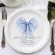 Elegante Teller für ihr Brautparty mit einer blauen Coquette-Bogen-Wasserfarbe, "etwas Blau vor mir" in einer schicken Kalligraphie-Schrift, und der Name der Braut und das Duschdatum in einfachen modernen Schriften.