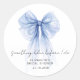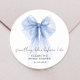 Elegante Aufkleber für Ihre Brautduscheinladungen, Gastgeschenke und Dankeschön-Karten mit einer blauen Coquette Bogen Wasserfarbe, "etwas Blau vor mir" in einer schicken Schrift, und der Name der Braut und das Duschdatum in einfachem modernem Schriftsatz.