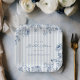 Dekorieren Sie den Tisch Ihres "Etwas Blaues"-Junggesellinnenabschieds mit unseren maßgeschneiderten Papptellern mit klassischen Chambray-Streifen und navyblauer floraler Linienkunst.