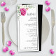 Cette carte de menu mariage conçue pour une célébration économique présente une belle branche d'eucalyptus ornée de délicates fleurs blanches roses et de feuilles doux vert sauge. Autour de la carte, une fine bordure noire apporte une touche d'élégance. Le mot MENU ainsi que les noms du couple sont présentés dans une police décorative design, ce qui le distingue. Au verso, la carte est noire, ce qui donne un contraste frappant avec le design avant.