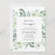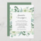 Cette élégante invitation au mariage comporte une épaisse bordure de verdure, d'eucalypse et de fleurs. Le design est accentué avec du texte manuscrit pour les noms de la mariée et du marié.
