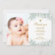 Fleurs blanches et Croix d'orInvitation de bébé fille Baptême personnalisée et abordable. Ce joli design a une aquarelle vert feuille avec texte doré. Le côté inverse a une croix d'or avec des fleurs d'aquarelle ou utilisez l'espace pour ajouter du texte et des photos supplémentaires. Cliquez sur Customiser pour choisir une couleur arrière - plan et modifier les polices et les couleurs du texte.