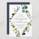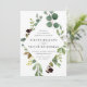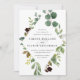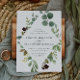 Des invitations de mariage botaniques élégantes dans des tons verts invitants présentent vos détails mariages encadrés par une bordure géométrique de feuillage d'eucalyptus vert aquarelle, de minuscules fleurs de marron, des bourgeons et des feuilles.