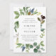 Elégant faire-part de mariage botanique encadre vos détails de célébration mariages avec une bordure d'aquarelle d'eucalyptus feuilles, fleurs bleues et feuillage vert. Les invitations se retournent vers le bleu marine fumé solide.