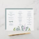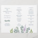 Modèle du programme de mariage plié Eucalyptus. Plier comme un accordéon à utiliser pour la cérémonie. Un petit jet de feuilles gris-bleu décore l'avant (panneau gauche) juste sous les noms du couple. Davantage de verdure et un brin de lavande "grandissent" du fond du papier blanc. L'inverse est de couleur gris-bleu uni.