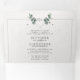 Un design élégant et minimaliste avec des illustrations de branches d'eucalyptus formant une crête autour de votre monogramme. Cette invitation tout-en-un durable vous ferait économiser de l'argent, pas besoin d'inclure des enveloppes RSVP, vos invités couperont le dernier panneau et vous le renvoyer comme carte postale.