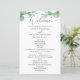 Create a polished ceremony experience with this double-sided wedding program featuring soft watercolor eucalyptus greenery across the top for a fresh, modern botanical look. Front side: a warm Welcome header with a clean order of ceremony layout (processional, readings, vows, rings, unity candle, recessional, and more). Back side: a dedicated Wedding Party section to list parents, officiant, maid of honor, bridesmaids, best man, groomsmen, flower girl, ring bearer, and any special roles. This design pairs elegant script with classic typography. Perfect for greenery, outdoor, garden, botanical, and modern classic weddings.