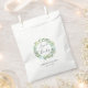 Gartenschicke Gastgeschenk Hochzeit-Taschen bedanken sich bei den Gästen im eleganten Frühlingsstil. Die Taschen sind mit einem Aquarellkranz aus grünem Eukalyptusblättern versehen, der Ihre individuelle Nachricht abbildet (mit "Liebe und Dank" dargestellt). Persönlich mit Ihren Namen und Hochzeitsdatum unten in eleganter Schrift. Entworfen, um mit unserer Eukalyptus Hochzeit- und Eventkollektion zu koordinieren.