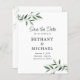 Budget Delicate Eukalyptus Blätter mit Shadow QR Code Ankündigung Datum freihalten... An der Vorderseite unserer erschwinglichen botanischen Save the Date-Karte befinden sich zarte Zweige grüner Eukalyptus-Blätter, die mit ihrem halbtransparenten Schatten geschmückt sind. Eingebettet zwischen den Filialen sind Ihre Einzelheiten der Hochzeitsankündigung in eleganter kursiver und serifenloser Typografie. Auf der Kartenrückseite befinden sich Ihre Rücksendeadresse, die URL der Hochzeitswebsite und eine QR-Beispielcode-Grafik, die Sie einfach durch Ihre eigene Hochzeitswebsite QR-Code ersetzen können - direkt auf der Personalisierungsvorlage. Alle Beispieltexte auf beiden Seiten der Karte lassen sich einfach mit eigenen Angaben auf der Personalisierungsvorlage überarbeiten.