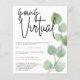 Eukalyptus Verlasse Skript Virtual Wedding. Ein Preis SMALLER 4,5" x 5,6" Alternative. Erhältlich in einem SEMI-GLOSS 110 lb CARD STOCK, der die Standardoption (dicker für Einladungen) ist, ODER einem SATIN FINISH 80 lb THINNER PAPER STOCK (ideal für Gehäuse). Umschläge sind optional und etwas größer als die Kartengröße. Wenn die aktuellen Umstände gemein sind, dass soziale Distanzierung unverzichtbar ist, und für jene Zeiten, in denen Sie Ihre Gelübde mit denjenigen teilen möchten, die zu weit weg leben, um sich persönlich bei Ihnen zu treffen, ist eine virtuelle Zeremonie per Live-Streaming das Beste. Dieses minimale, aber stilvolle Design hat einen Single eucalyptus Zweig, der die Länge der rechten Seite, mit einem informellen Set-Skript für den Header Going Virtual. Die Erholung des Textes kann leicht auf Ihre eigenen Daten personalisiert werden. Sie können auch den Stil und die Farbe des bearbeitbaren Schriftartes ändern, wenn Sie es wünschen, indem Sie die Option Weitere anpassen wählen, sowie die Hintergrundfarben auf der Vorder- und Rückseite. Sie können auch die in dieser Sammlung verfügbaren Namen- und Adressetiketten des Gastes berücksichtigen, um Ihre Hochzeitsmailings leichter zu machen.