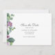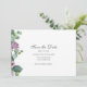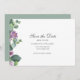 Moderne Eukalyptus Botanische Schrift Save the Date Karte. Lila und grüne Blüte mit Schriftzypografie.