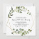 Diese goldene Rahmen Eukalyptus kalligrafischer Platz Hochzeitseinladung ist perfekt für eine moderne Hochzeit. Das Design besticht durch handbemalte grüne Blätter, die einen goldenen geometrischen Rahmen schmücken.