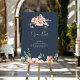 Dieses eukalyptus Garten Rose Blumenzwiebelposter ist perfekt für eine rustikale Hochzeit. Die rosa, rot-gelbe Rosa Blume mit Eukalyptus-Blätter im dunkelmarineblauen Hintergrund ist in Rosa gehalten.