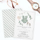 Elegante böhmische Mädchen Dusche Einladung Karte Postkarte mit Aquarell grünen Eukalyptus und niedlichen Baby-Kleidung, Spielzeug.