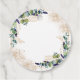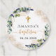 Für eine elegante Taufe, geschlechtsneutral. Ein schick weißer Hintergrund. Ein schick weißer Hintergrund. Dekoriert mit grünen Aquarellen Eukalyptusbäumen, Blätter, Grünpflanzen, Imitaten vergoldeten Blätter und goldenen Glitzer Flecken. Personalisieren und fügen Sie den Namen des Kindes und ein Datum ein. Schwarze und goldene Buchstaben. Zurück: Platz, an dem Sie per Hand schreiben können.