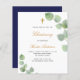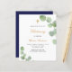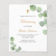 Weiß, mit Eukalyptusgrün und goldenem Kreuz dekoriert. Personalisieren und die Kinder Name und Zeremonie Details. Schwarze und goldfarbene Buchstaben. Zurück: marineblau Hintergrund.