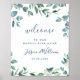Begrüßen Sie Ihre Hochzeitsfeier mit dem Watercolor Eukalyptus Greenery Wedding Welcome Poster mit üppiger botanischer Vegetation und weißen Blume in Aquarellfarbe, "Willkommen zu unserem glücklichen aller Zeiten", Ihren Namen und Hochzeitsdatum in einer schicken Mischung aus modernen Blockbauten und handgeschriebenen Kalligrafietypen.