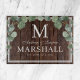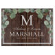 Rustikales dunkelbraunes Holz mit Eukalyptus-Grün-Schneidebrett mit den Paaren Vornamen, Nachname Monogramm, vollständiger Nachname und Hochzeitstermin, erhältlich in anpassbaren Vorlagen. Ein niedliches Grillgeschenk zum Thema Hochzeitsfeiern.