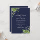 Diese elegante eukalyptusgrüne botanische marineblaue Hochzeitseinladung kann mit Ihren Informationen in chic typografie mit Ihrem Monogramm auf der Rückseite personalisiert werden. Entwickelt von Thisisnotme©