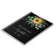 Ein schwarzer Hintergrund. Mit Sonnenblumen geschmückt und mit Eukalyptus-Pflanzen geschmückt. Fügen Sie einen Namen, Text hinzu. Der Name wird mit einem modernen handgeschriebenen Stilskript mit Swashes geschrieben. Um die Swashes behalten, löschen Sie nur den Beispielnamen, verlass die Leerzeichen oder Emoji's vor und nach dem Namen.