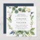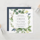Unsere Eukalyptus Grove Hochzeitseinladung in einem einzigartigen quadratischen Format umrahmt Ihre Hochzeitsdetails mit Aquarellen Eukalyptusblättern, grünen Blätter und kleinen marineblauen Blüten. Eine moderne und Bio Wahl für Herbst- und Winterhochzeiten mit frischem botanischem Blattwerk und eleganten Schriftzeichen.