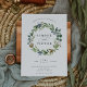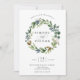 Elegante botanische Hochzeitseinladungen mit einem Kranz aus üppigem Eukalyptus-Blattwerk, grünen Blätter und winzigen blau blauen Knospen, die Ihre Namen umkreisen. Personalisieren Sie Ihre Hochzeitsdetails unten.