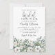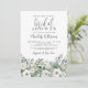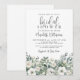 Einfache Boho-Hochzeitsshower-Einladung mit Grün. Perfekt für Feiern im Frühling bis Herbst, verfügt dieses minimalistische Design über einen sauberen weißen Hintergrund auf der Vorder- und Rückseite für einen frischen, zeitlosen Look. Eine weiche Wasserfarben-Anordnung aus Eukalyptusblättern, fließendem Grün und zarten weißen Blumen befindet sich entlang des unteren Randes und fügt eine natürliche, luftige Note hinzu, die elegant, modern und subtil romantisch wirkt.