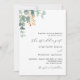 Ein schick weißer Hintergrund. Dekoriert mit grünen Aquarellen Eukalyptusbäumen, Blätter, Grünpflanzen und einem goldenen Imitat. Personalisieren und fügen Sie Ihre Namen und Hochzeitsdetails. Schwarze Buchstaben. Zurück: Weiße Hintergrundfarbe.