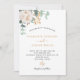 Ein schick weißer Hintergrund. Weiße Blumen, Blume (Pony) und grüne Aquarelltöne, Blätter, Grünpflanzen und ein goldenes Imitat. Personalisieren und fügen Sie Ihre Namen und Hochzeitsdetails. Schwarze und goldene Buchstaben. Zurück: grüne Hintergrundfarbe.