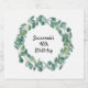 Weißer Hintergrund, schwarzer Text. Mit Eukalyptuskranz dekoriert. Personalisieren und fügen Sie einen Namen und Alter. Ein modernes handgeschriebenes Stilskript.