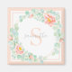 Moderne Aquarellkunst mit Eukalyptus-Zweigen mit reichhaltigem Blattwerk kombiniert mit pfirsichrosa Pfannkuchen, die einen schönen Blumenkranz bilden. Anpassbare Monogramm und Name in einer extravaganten Grenze. Weiche Pastellfarben, Pfirsich, Salbei, hellgrün, Jade, Creme, Rosa, Rosa rot, hellorange, Korallen. Pfirsichgrenze.