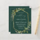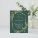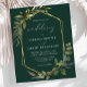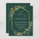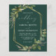 Diese elegante rustikale Hochzeitseinladung besticht durch einen geometrischen Rahmen aus vergoldeten Imitaten, der mit Eukalyptus und Olivenbäumen auf smaragdgrünem Hintergrund verziert ist. Das Wort "Hochzeit" erscheint in kalligrafischer Schrift. Passen Sie den weißen Text mit den Namen der Braut und des Bräutigams und den Hochzeitsdetails auf der Vorderseite an, und ihre Initialen und Website-URL auf der soliden smaragdgrünen Rückseite.