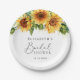 Rustikale Brautparty-Papier-Teller mit Aquarellbouquets von Sonnenblumenblumen und Eukalyptusgrün, eine stilvolle Kalligraphie-Schrift und der Name der Braut in eleganter Serif-Typografie.