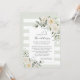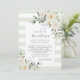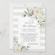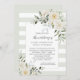 Die Hochzeitseinladung zeigt ein romantisches und elegantes Design. Es ist mit einer üppigen Blumenstruktur und weißen und cremefarbenen Blume wie Rose und Pfannkuchen, grünen Blättern und weißen Beeren verziert. Der Hintergrund wechselt durch hellgrüne und weiße horizontale Streifen zu einer subtilen und stilvollen Textur. Der Haupttext ist in einem weißen rechteckigen Kasten gerahmt, der von Blumenakzenten umgeben ist und eine ausgeglichene und raffinierte Ästhetik schafft. Das Gesamtbild ist weich, charmant und perfekt für eine raffinierte Feier. Einfach mit Ihren Informationen personalisieren.