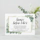 Grüne Eukalyptus, Brühe vor mir, Hochzeit Probe Dinner Einladung Karte. Planen Sie ein Hochzeitsfest Probe Dinner mit der zu sein Braut und zu sein, vor ihrem großen Tag? Die Rustikale Einladungs-Card zum Abendessen der Hochzeit Probe lädt Sie ein. Fügen Sie Ihre Probe Dinner Details in passendem schwarzen Schriftart / Buchstaben. #TeeshaDerrick