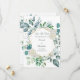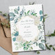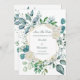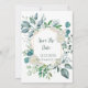 Schöne, weiße Rosen mit Grün und Eukalyptus-Blätter auf dieser Hochzeit speichern Sie die Datumskarte. Elegant und formell.