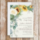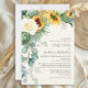 Rustikale, aber elegante gelbe Sonnenblumen, weiße Rosen, Eukalyptus und andere Pflanzen auf einer botanisch cremefarbenen Hochzeitseinladung. Kontaktieren Sie uns für Hilfe bei der Anpassung oder der Anpassung von Produkten. Die Namen der Braut und des Bräutigams sind in einem eleganten Skript-Schriftart.