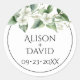 Dieser elegante, rund blumengeschmückte Aufkleber zeigt einen schönen Eukalyptuszweig mit weißen Blume und schlängelgrünen Blätter oben. Die Namen des Paares sind in dekorativer Typografie. Es gibt einen dünnen Rand.