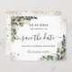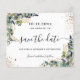 Ein trendiger Save the Date für eine 40. Geburtstagsfeier (oder ein beliebiges Alter). Ein stilvoller weißer Hintergrund mit Eukalyptus, Grünpflanzen, goldenem Blattwerk und Imitaten goldener Glitzer Staub. Personalisieren und fügen Sie Datum, Namen und Text hinzu. Der Text: Save the Date wird mit einem großen angesagten, handgeschriebenen Stilskript mit Swashes geschrieben.