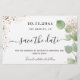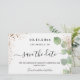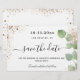 Eine trendige Hochzeit speichern Sie das Datum. Ein stilvoller weißer Hintergrund mit Eukalyptusblättern und Imitaten goldenen Glitzer Staub. Personalisieren und fügen Sie Datum, Namen und Text hinzu. . Der Text: Save the Date wird mit einem großen angesagten, handgeschriebenen Stilskript mit Swashes geschrieben.