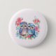 Schaltfläche mit dem Bild eines Eulenpaares in der Liebe, das auf einem Zweig sitzt. Umgeben von hübschen blauen, grünen und rosa Blumen.