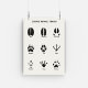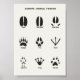 Ein Mauerkunstposter mit Sammlung von Tierspuren in Europa für Kinder oder Lehrer mit Hirsch, Rehe, Wildschwein, Dachs, Fuchs, Ente, Eichhörnchen, Frosch und Murtenspuren. Ändern Sie einfach den Text in Ihre eigene Sprache!