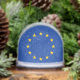 European Union flag snow globe with custom photo and text. Personalized Christmas gift idea for the Holidays. Upload your own image on the back or front. EU flag design with yellow stars. Includes transparent overlay for Holiday greeting. Unique family and bulk business gifts.