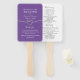 Éventails à main modernes, minimalistes, élégants et simples avec calligraphie violette pour programme de mariage avec cœur de corde argentée.