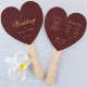Un ventilateur de programme de mariage simple mais élégant en forme de coeur pour un thème bordeaux et or mariage. Les titres et les noms (et les initiales) de la mariée et du marié sont écrits dans un élégant script calligraphique, le reste en casquette. L'arrière - plan est (une teinte plus foncée) bordeaux, le texte est jaune doré. A l'arrière, il a sur le côté gauche le programme de cérémonie mariage et, sur le côté droit, la fête de mariage (avec 2 colonnes différentes pour l'équipe mariée et l'équipe mariée). et sous eux un court message Merci.