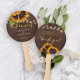 Elégant mariage campagnard rustique faveur merci modèle de ventilateur de main ronde avec de beaux bouquets de tournesols jaune et orange brillants, des cordes de lumières scintillantes et un script de calligraphie en faux or chic sur un arrière - plan en bois de grange brun foncé. +++++++++++++++++ + Facile à personnaliser avec vos détails !+++++++++++++ Convient pour le pays rustique chic | ferme | cottage jardin d'été | automne automne nuit mariages extérieurs.