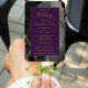 Ce ravissant éventail de programme de mariage moderne présente un fond d'agate noir rehaussé de fausse brillance dorée. Le texte apparaît dans une écriture élégante dorée et des polices copperplate sur un rectangle violet profond.