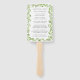 Éventail de main de programme de mariage rustique avec vos détails entourés de feuilles d'olive. Vos détails sont dans une police gris moyen. Le devant comporte vos événements de cérémonie et le dos comporte votre cortège de mariage. Les éventails à main sont parfaits pour un mariage en plein air en été.