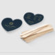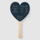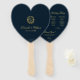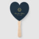 Un élégant éventail de programme de mariage en forme de cœur pour un thème de mariage bleu marine et or. Les titres et les noms (et les initiales) de la mariée et du marié sont écrits dans un élégant script calligraphique, le reste en majuscules. Le fond est bleu marine, le texte est jaune doré. Sur le devant, au-dessus du texte, se trouve un monogramme dans une couronne de feuilles dorées vintage. Au dos, il y a sur le côté gauche le programme de la cérémonie de mariage et, sur le côté droit, les participants au mariage (avec 2 colonnes différentes pour l'équipe de la mariée et l'équipe du marié) et en dessous d'eux un court message de remerciement.